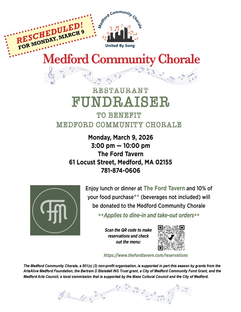 A Restaurant Fundraiser at The Ford Tavern HAS BEEN POSTPONED and now will take place on Monday, March 9, to benefit the Medford Community Chorale & Youth/Young Adult Chorus (please see attached flyer).