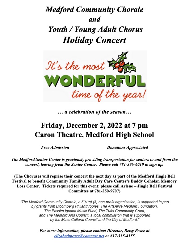 The Medford Community Chorale and Youth / Young Adult Chorus (MCC) rehearse “Shalom” for their 2022 holiday concert β- “It’s the MostΒ Wonderful TimeΒ of the Year” β- which will take place on Friday, December 2, 2022, at 7 PM in the Caron Theatre in Medford (MA) High School. (Director: Betsy Pesce. Accompanist and Vocal Coach: Dr. Holly Zagaria)