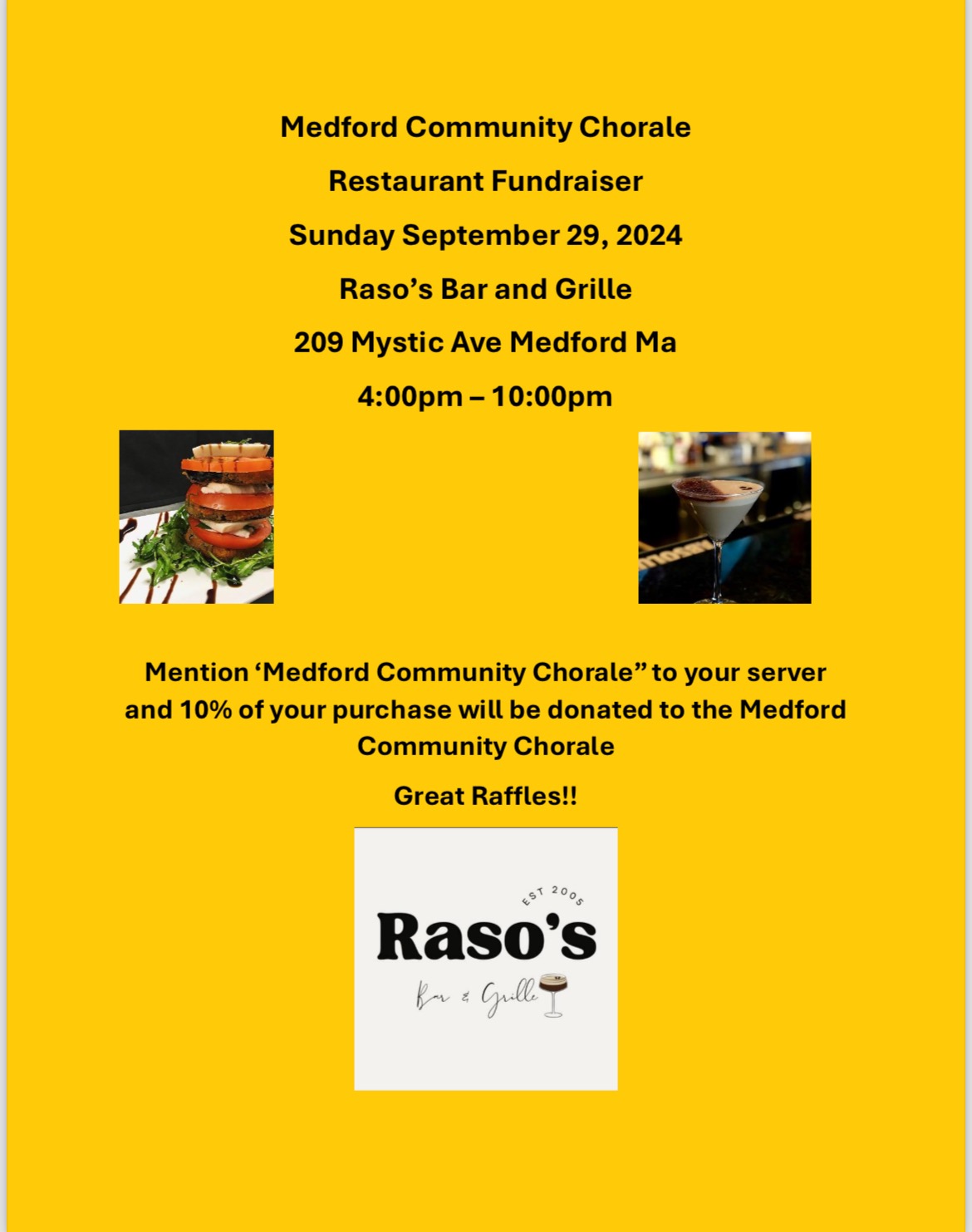 Mention “Medford Community Choraleβ to your server and 10% of your purchase will be donated to the Medford Community Chorale.Β