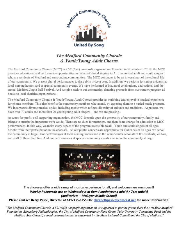 The Medford Community Chorale, a 501(c)(3) nonprofit organization, is supported in part by grants from the ArtsAlive Medford Foundation, Tufts University Community Fund, the Medford Arts Council, a local commission that is supported by the Mass Cultural Council and the City of Medford Community Fund Grant, and Bloomberg Philanthropies.